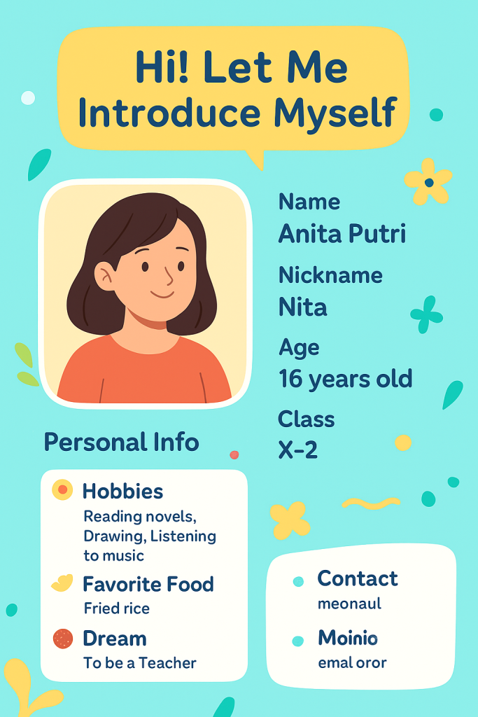 Kamu seorang murid baru? Jangan khawatir! Kamu bisa memperkenalkan diri pada teman-temanmu seperti contoh di bawah ini: